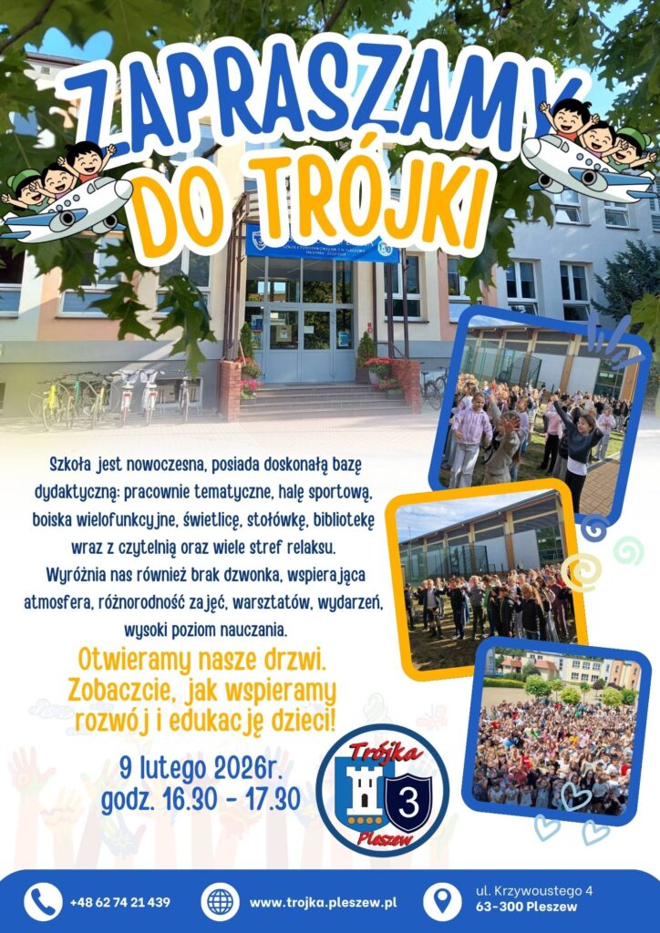 9 lutego rusza rekrutacja do klas pierwszych na rok szkolny 2026/2027. W zakładce https://trojka.pleszew.pl/szkola/rekrutacja-sp znajdują się wszystkie informacje: harmonogram oraz wnioski i zgłoszenia.