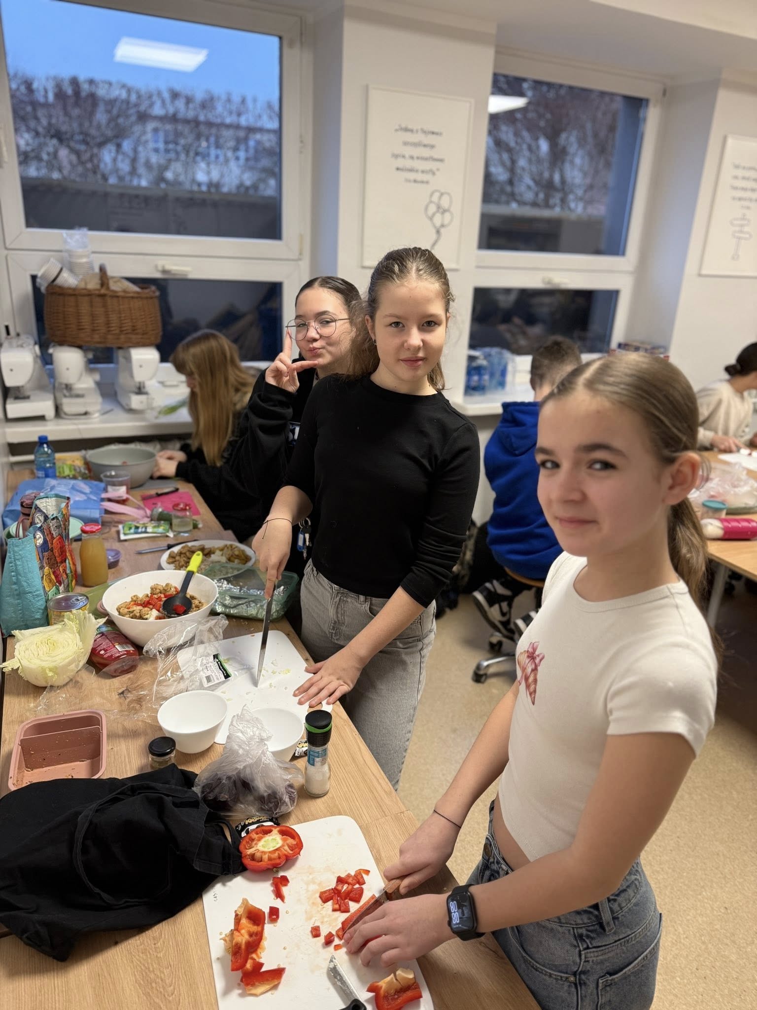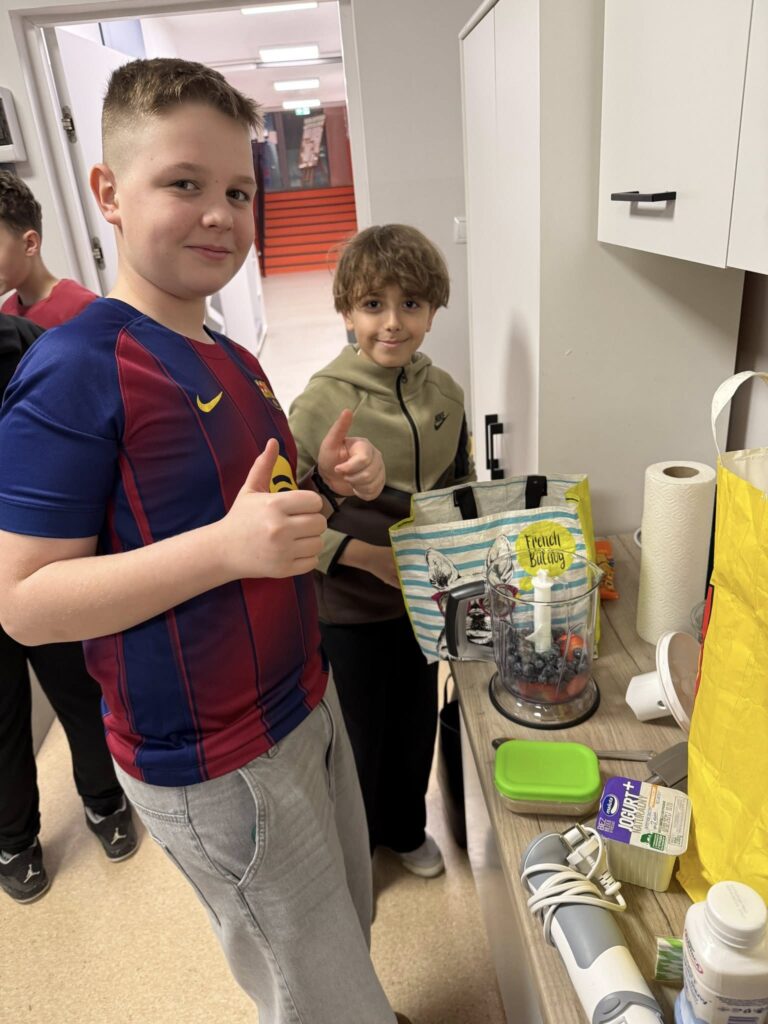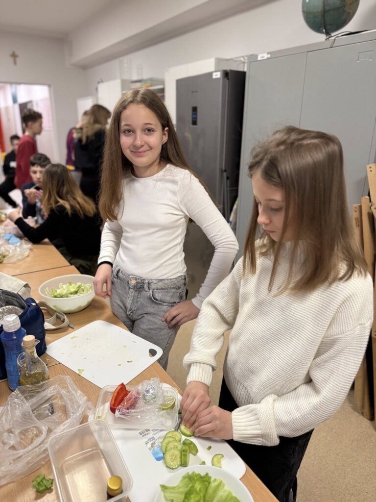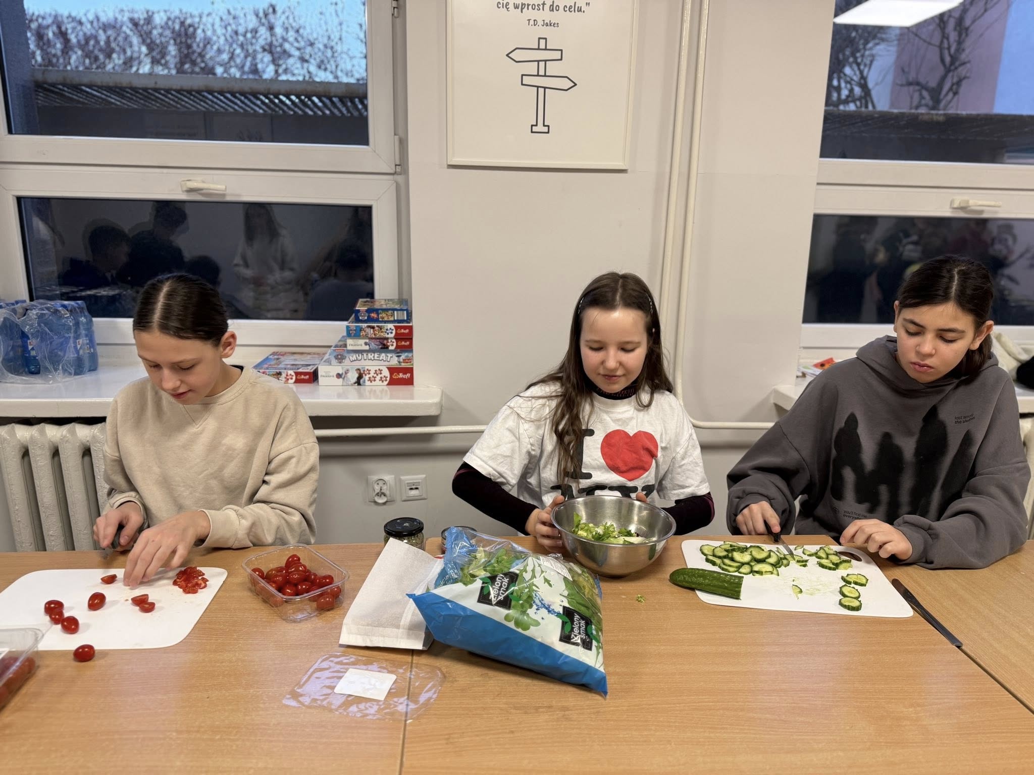 Klasa 5d w ramach zajęć edukacji zdrowotnej zamieniła dziś swoją salę na kolorową, pachnącą kuchnię – powstały zdrowe przekąski, sałatki, naleśniki i koktajle. Uczniowie pracowali w zespołach, rozmawiając o tym, jak komponować wartościowe drugie śniadanie i dlaczego warto sięgać po warzywa oraz owoce. Efektami swojej pracy piątoklasiści podzielili się także z dyrekcją szkoły, która z uśmiechem degustowała ich pyszne smakołyki – zdrowo, twórczo i bardzo apetycznie!