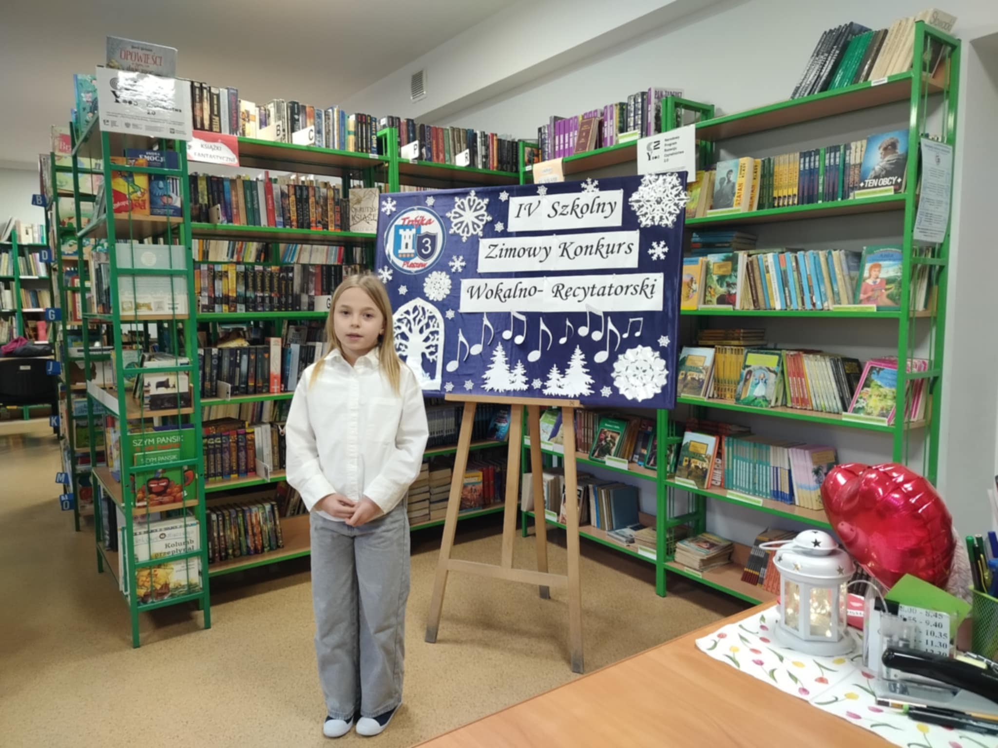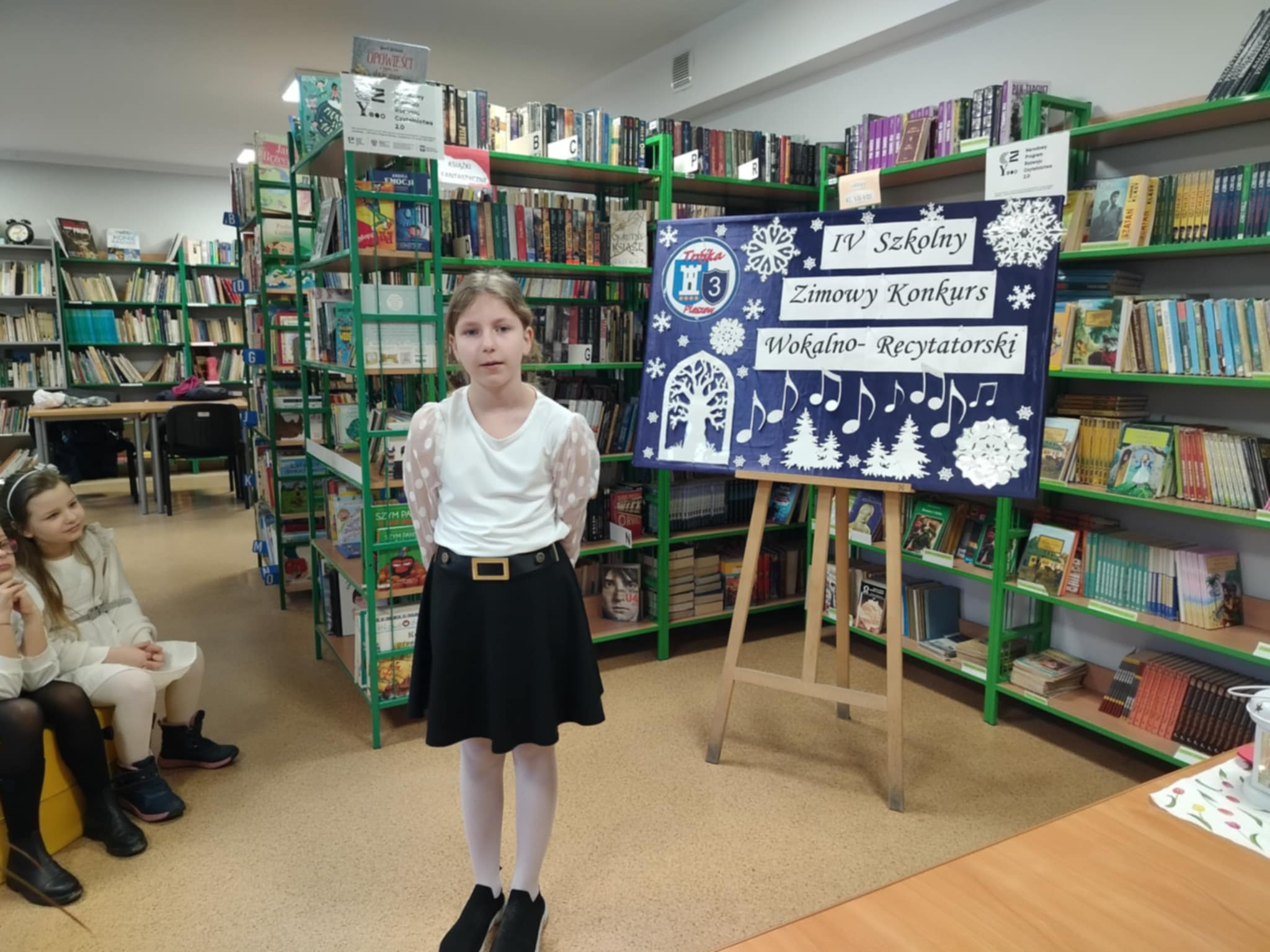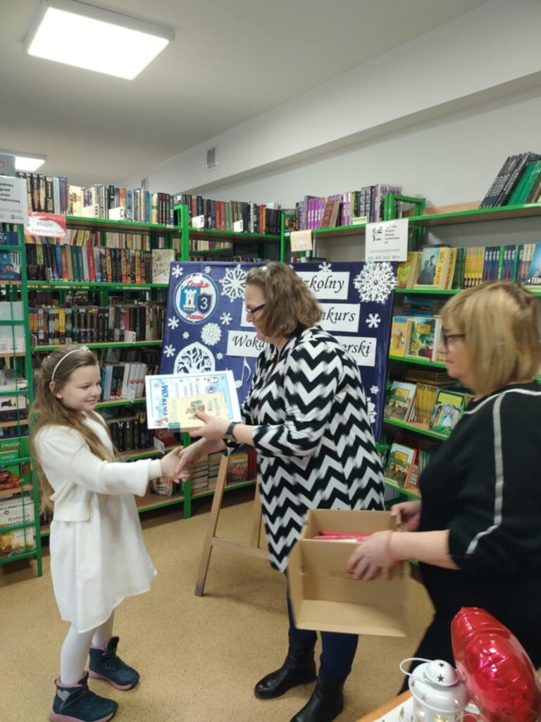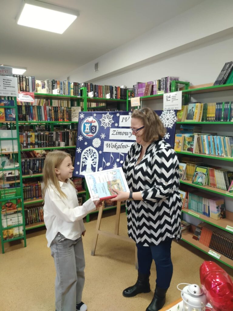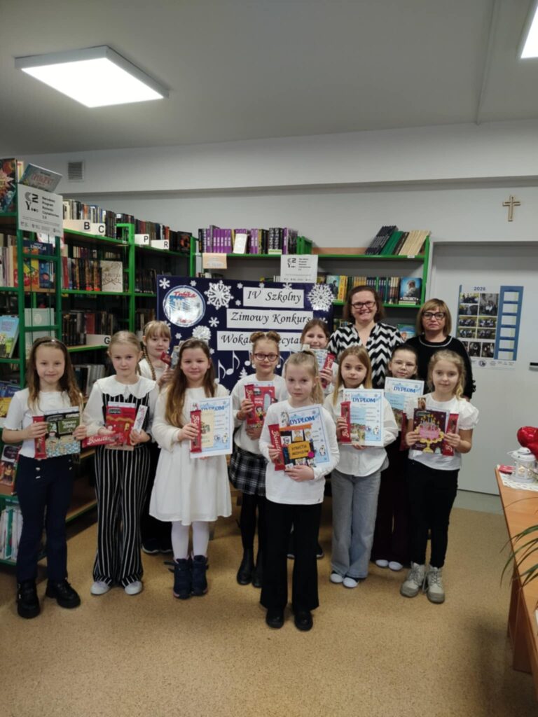 IV Szkolny Zimowy Konkurs Wokalno-Recytatorski dla klas drugich odbył się w szkolnej bibliotece w miłej i uroczystej atmosferze. W wydarzeniu wzięli udział uczniowie klas 2b, 2c oraz 2d, którzy z dużym zaangażowaniem zaprezentowali swoje umiejętności wokalne i recytatorskie. Młodzi artyści zachwycili publiczność piękną interpretacją zimowych piosenek oraz wierszy o tematyce świątecznej i zimowej. Występy były pełne emocji, odwagi i dziecięcej radości, a każdy uczestnik zasłużył na ogromne brawa.